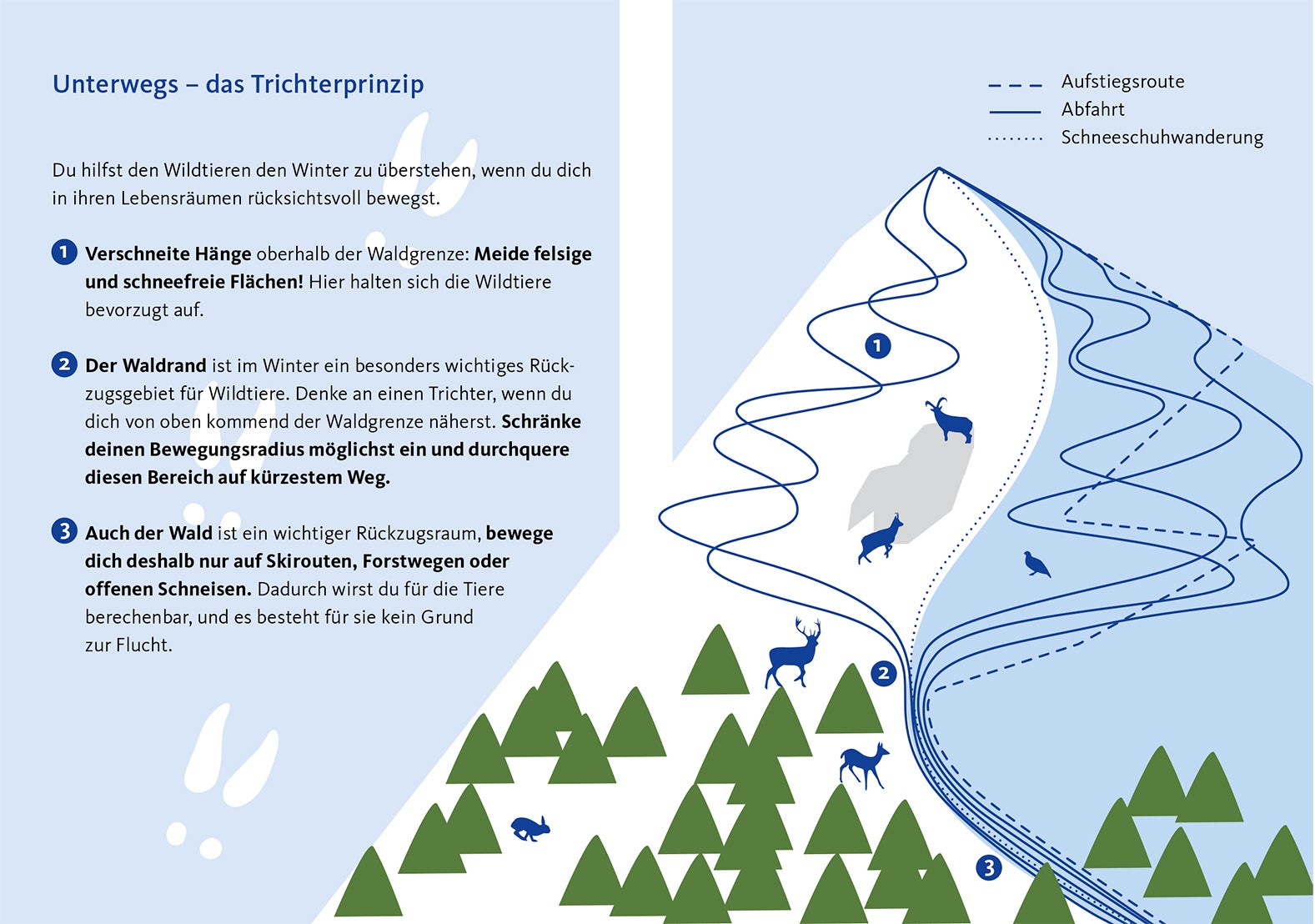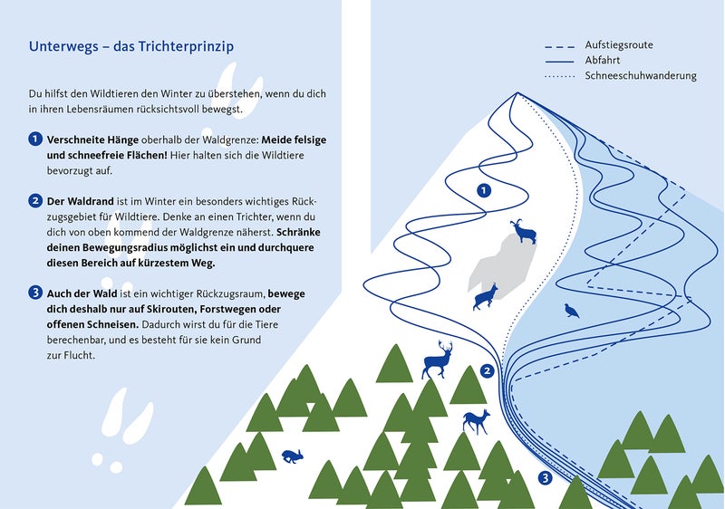 Wintersportler sollten im Winter daher das Begehen oder Befahren bevorzugter Rückzugsgebiete von Wildtieren - wie felsige und schneefreie Flächen oberhalb der Waldgrenze, wo sich oft wichtige Nahrungsplätze befinden, sowie den strukturreichen Waldrand – vermeiden und die so genannte Trichter-Regel befolgen: Wie bei einem Trichter gilt es, diese Gebiete auf kürzestem Weg zu durchqueren. Im Wald sollten nur Skirouten, Forstwege oder offene Schneisen genutzt werden, um für die Tiere berechenbar zu bleiben und keinen Grund zur Flucht zu geben. Tierspuren sollte man nie folgen sowie immer Abstand von Wildtieren halten. Hunde sind an der Leine zu führen. Ruhegebiete sollten respektiert werden. Plötzliche Störungen, wie es bei überraschend auftauchenden Skifahrern und Skitourengehern der Fall ist, bedeuten für Wildtiere Stress und extrem viel Energieverbrauch bei einer Flucht. Das kann schwerwiegende Folgen für die Tiere haben: Ihre körperliche Verfassung verschlechtert sich, sie werden anfälliger für Krankheiten und können an Erschöpfung sterben. Da Störungen während des Fressens besonders beeinträchtigend wirken, sollten die Dämmerungs- und Nachtstunden, die oft der Nahrungsaufnahme dienen, vermieden werden.